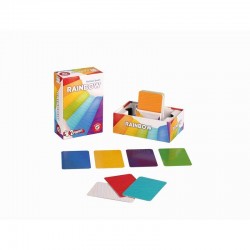 Dans ce duel épuré et coloré, pose tes cartes sur une face ou sur l'autre pour former le plus d'arcs-en-ciel possible. Évite les couleurs en double et les faces noires, recherche les faces blanches, mais surtout affute ta tactique et ta mémoire pour gagner ! Tu ne connais pas la couleur du dos de tes cartes, que voit ton adversaire. Tu devras donc choisir de quel côté poser celles-ci, ou de retourner une carte présente sur la table ! Sois le premier à compléter l'arc-en-ciel de 6 couleurs que vous composez en commun.