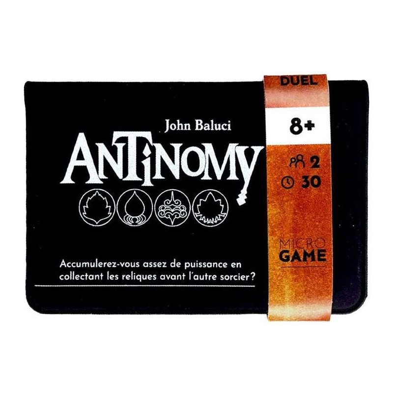 à partir de 8 ans2 joueurs30 minutesAntinomy est une bataille d'esprit en tête à tête de 2 sorciers concurrents à la recherche de puissants Cristaux de Paradoxe. Jouez une seule carte de votre main en utilisant la couleur ou le symbole pour plonger dans le passé, ou utilisez le chiffre pour voler dans le futur. La carte sur laquelle vous atterrissez est échangée avec la carte que vous avez jouée, ce qui vous permet de construire une main gagnante. Où que vous alliez, un jeu de cartes astucieux et un ensemble de trois paradoxes provoquent des paradoxes qui forment vos propres cristaux. Ou affrontez votre adversaire dans un Clash pour prendre le contrôle de ses cristaux. La collecte de 5 de ces cristaux vous permettra de contrôler l'espace et le temps. Avez-vous ce qu'il faut pour exercer le pouvoir d'Antinomie ?
