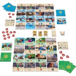 Contenu : 32 tuiles basiques recto-verso (16 pour chaque joueur), 52 cartes (7x7cm), 5 tuiles Action, 20 pions Nourriture, 9 pions Requin, 18 jetons Victoire Militaire, 4 fiches de Clan, 1 livret de règles