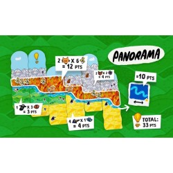 Dans ce jeu de placement de tuiles pour 2 à 4 joueurs, partez en balade et tentez de réaliser votre plus beau Panorama avant le coucher du soleil. Composez votre panorama, une tuile à la fois. À la fin de la partie, marquez des points en fonction du nombre d’Animaux et de Fleurs dans votre paysage - car oui, ils adorent la verdure ! Mais soyez malin… car plus vous prenez une tuile loin de votre montgolfière, plus vous laissez de tuiles aux autres joueurs ! Renouvelez vos parties grâce à des objectifs variés, tels que la rivière la plus longue ou le ciel le moins nuageux.