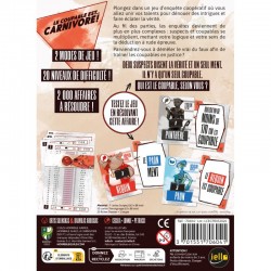 Le Coupable est… Carnivore ! est un jeu d’enquête et de déduction pour 1 à 5 joueurs dans lequel vous devez résoudre des affaires criminelles en analysant les témoignages des suspects.