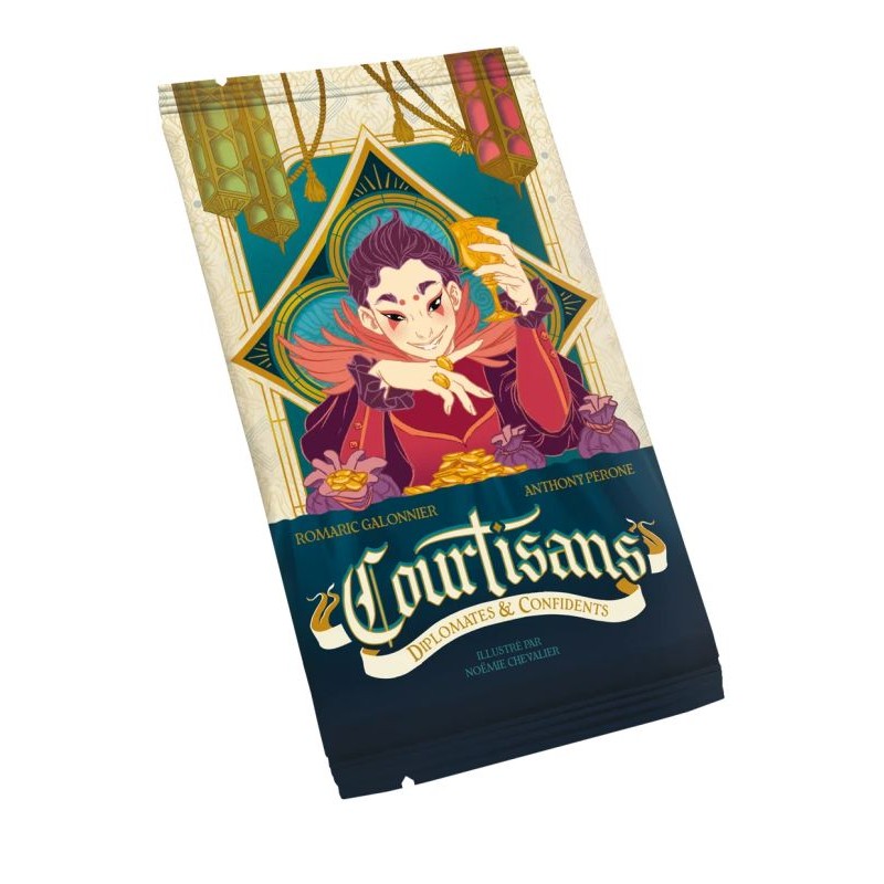 à partir de 8 ansde 2 à 6 joueurs20 minutesCourtisans : Diplomates et Confidents propose 18 nouvelles cartes à mélanger simplement au paquet du jeu de base, avec 2 nouveaux rôles ajoutant encore plus d'interaction et de retournements de situation. Les diplomates (2 par famille) permettent de voler une carte dans la zone où ils sont joués, et de l'ajouter devant soi. Les confidents (1 par famille) permettent de jouer immédiatement une autre carte dans la même zone (devant soi, devant un adversaire, ou à la table de la reine).