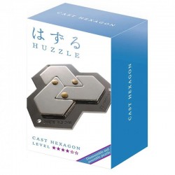 Ce casse-tête est fait d’une série de pièces hexagonales, avec trois pièces intérieures et un cadre extérieur. Il s’agit de faire glisser et tourner les pièces à l’intérieur du cadre pour essayer de les en faire sortir. À première vue, les pièces semblent identiques, mais l’extérieur et l’intérieur ne sont pas les mêmes, de sorte que les trois formes sont différentes.