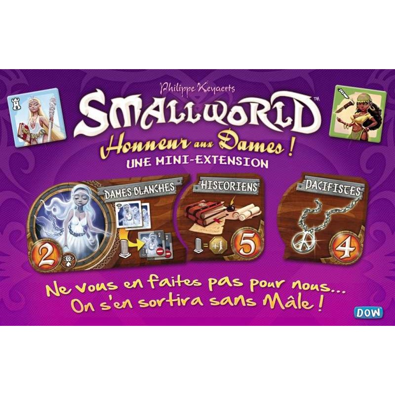 Smallworld – Honneur aux Dames est une mini extension pour le jeu de conquêtes Smallworld. Découvrez trois puissants peuples exclusivement féminins : les Gitanes, les Prêtresses et les Dames Blanches, ainsi que deux pouvoirs inédits !