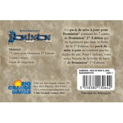 La seconde édition de Dominion® contient des cartes qui ne figuraient pas dans la 1ère. Ce pack a été conçu pour ceux qui veulent mettre à jour leur boîte, sans avoir à acquérir l’intégralité de la nouvelle édition. Il propose les 7 cartes inédites : Artisane, Brigand, Messagère, Marchande, Braconnière, Garde, et Vassal. Chacune d’elles est en plusieurs exemplaires, prêts à être intégrés à votre première édition.