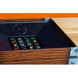 Contenu : 1 boîte de jeu contenant 16 dés Objet Précieux. Il s’agit du Coffre. 1 plateau Grille, 24 jetons Pirate (6 de chaque couleur), 1 jeton Clé, 4 pions Perroquet (1 de chaque couleur), 4 cartes Parchemin, 1 carte Richesse, 1 sablier de 30 secondes.