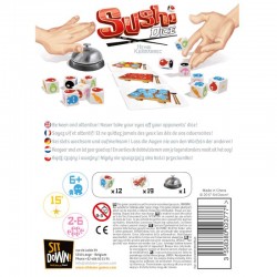 Empilez sur le côté, face cachée, tous les plateaux de sushis puis retournez-en trois, face visible, au centre de la table. La sonnette doit être accessible à tous. Le joueur le plus âgé prend 6 dés de couleur identique puis choisit, pour le premier duel, son adversaire qui prend les 6 dés restants. Il est très important que chaque duelliste ait un set de dés de couleur différente.