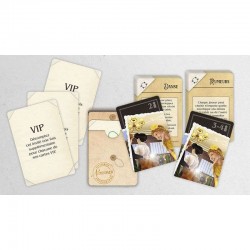 à partir de 10 ansde 2 à 4 joueurs45 minutesContenu : 4 paravents avec une piste de score et un résumé du décompte final 4 plateaux Salle de réception double face 4 lots de 14 silhouettes avec des socles 4 tables 4 cartes VIP 4 marqueurs de score 1 carte Premier joueur/Aide de jeu 14 enveloppes Invité 42 cartes Préférence 12 cartes Échanges 40 décorations 9 cartes Enchères