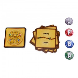 TAKE GEM ALL réinvente les jeux de mots en alliant la mécanique du célébrissime Petit Bac de notre enfance à la folie d'un Jungle Speed. Emparez-vous d’un maximum de pierres précieuses en étant le joueur le plus rapide à donner une réponse correspondant au thème joué et commençant par l’une des quatre lettres en jeu ! Mais attention, méfiez-vous des cartes pièges qui pourraient vous ralentir et des diamants qui risqueraient de bouleverser le cours du jeu...