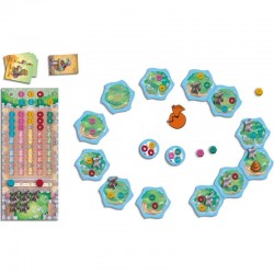Contenu : 12 tuiles Île, 4 plateaux Ecole, 22 tours, 1 pion Mère Nature, 130 disques Étudiant, 1 sac, 4 tuiles Nuage, 5 pions Professeur, 40 cartes Assistant, 12 cartes Personnage, 20 pièces, 4 tuiles Entrée interdite et 1 livret de règles.