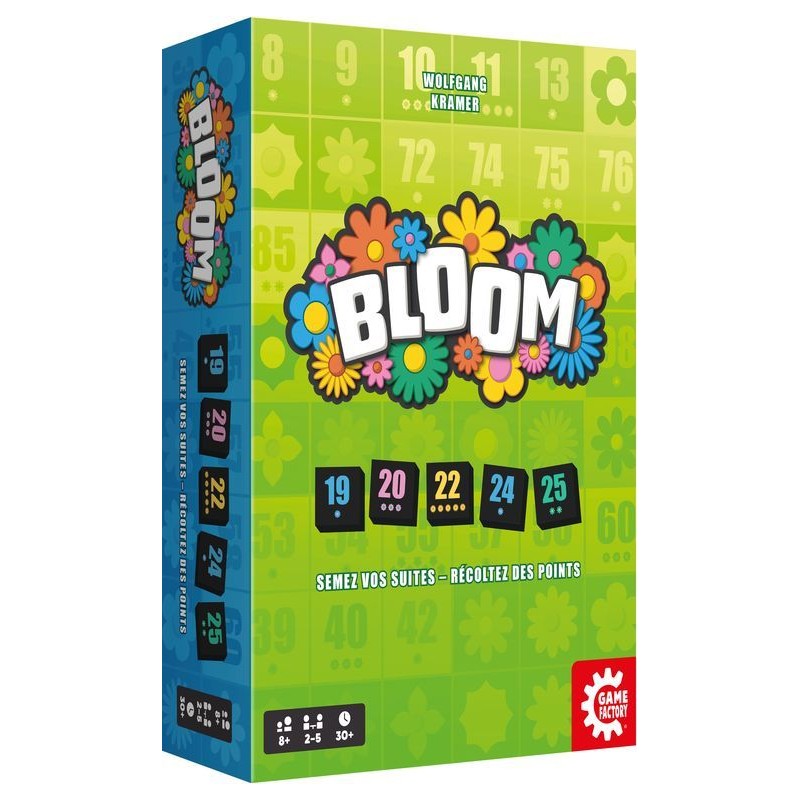 à partir de 8 ansde 2 à 5 joueurs30 minutesDans Bloom, chaque choix compte : poser ses tuiles pour marquer rapidement des points ou en piocher d'autres pour viser une suite plus lucrative ? Assemblez des suites numériques astucieuses, volez des tuiles à vos adversaires, optimisez vos poses pour récupérer les jetons les plus convoités. Plus vos suites comptent de fleurs, plus vous marquez. Mais attention à ne pas trop garder en main : chaque fleur non posée vous coûtera cher ! Grâce à une prise en main rapide, une tension constante et des interactions malicieuses, Bloom offre une expérience aussi accessible que stratégique, entre planification, opportunisme et prises de risques calculées.