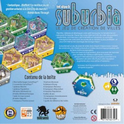 à partir de 12 ansde 1 à 4 joueursde 60 à 90 minutesSuburbia est un jeu de pose de tuiles dans lequel chaque joueur essaie de construire un moteur économique et une infrastructure qui seront initialement autosuffisants, et finiront par devenir à la fois rentables et encourager la croissance démographique. Au fur et à mesure que votre ville grandit, vous modifierez à la fois vos revenus et votre réputation. Au fur et à mesure que vos revenus augmentent, vous disposerez de plus d’argent pour acheter des bâtiments de meilleure qualité et plus précieux, comme un aéroport international ou un immeuble de bureaux de grande hauteur. Au fur et à mesure que votre réputation augmente, vous gagnerez de plus en plus de population – et le joueur avec la plus grande population à la fin de la partie gagne. Au cours de chaque partie, les joueurs s’affrontent pour plusieurs objectifs uniques qui offrent une augmentation supplémentaire de la population – et les bâtiments disponibles dans chaque partie varient, vous ne jouerez donc jamais deux fois la même partie !