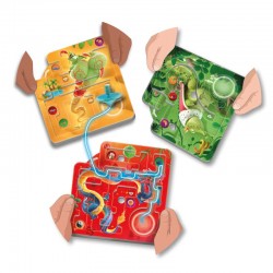 LA TOUPIE VOYAGEUSE est un jeu solo ou coopératif pour tout âge dès 6 ans. Chaque mission représente un parcours que les joueurs vont devoir effectuer avec une toupie en la passant d’un plateau à un autre. Ils représentent 8 mondes merveilleux en relief avec plusieurs cibles. Au début de chaque mission, les joueurs identifient ensemble les cibles à atteindre et se répartissent les plateaux indiqués. Le premier joueur lance la toupie avec l’aide du propulseur et la déplace en inclinant son plateau pour la diriger vers sa cible. Une fois la cible atteinte, le joueur guide la toupie vers la sortie pour la faire passer sur le plateau tenu par le joueur suivant. La dynamique de relais entre les joueurs se poursuit ainsi jusqu’à la réalisation complète de la mission. La difficulté des défis s’accroit progressivement. Des trophées autocollants permettent de valider chaque mission réussie !