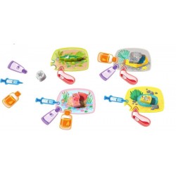 Aïe, aïe, aïe, les animaux sont malades ! Il faut vite les soigner: le crocodile souffre d’une rage de dents, l’éléphant est enrhumé, le guépard a des maux de ventre et le flamant rose s’est cassé la patte. Prends la mallette de vétérinaire pour soigner les animaux. Qui guérira le plus rapidement en plaçant correctement les tuiles de soins ?