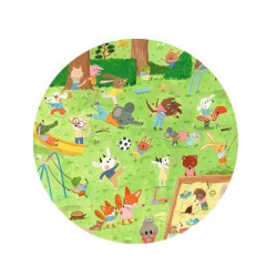 à partir de 3 ansCe puzzle offre une scène colorée et animée représentant un square où divers animaux s'amusent. Une fois les 35 pièces assemblées, les enfants sont invités à rechercher dans l'image centrale les éléments illustrés sur la frise entourant le puzzle, transformant ainsi l'activité en un jeu de "cherche et trouve".