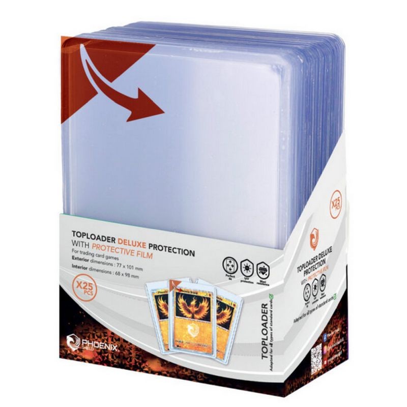Le lot de 25 Top Loaders Deluxe Phoenix Shield offre une protection rigide et fiable pour vos cartes les plus précieuses. Idéals pour le stockage, l’exposition ou l’expédition, ces protège-cartes transparents assurent une excellente visibilité tout en protégeant efficacement contre les chocs, la poussière et les manipulations. Un indispensable pour tout collectionneur ou joueur de TCG.